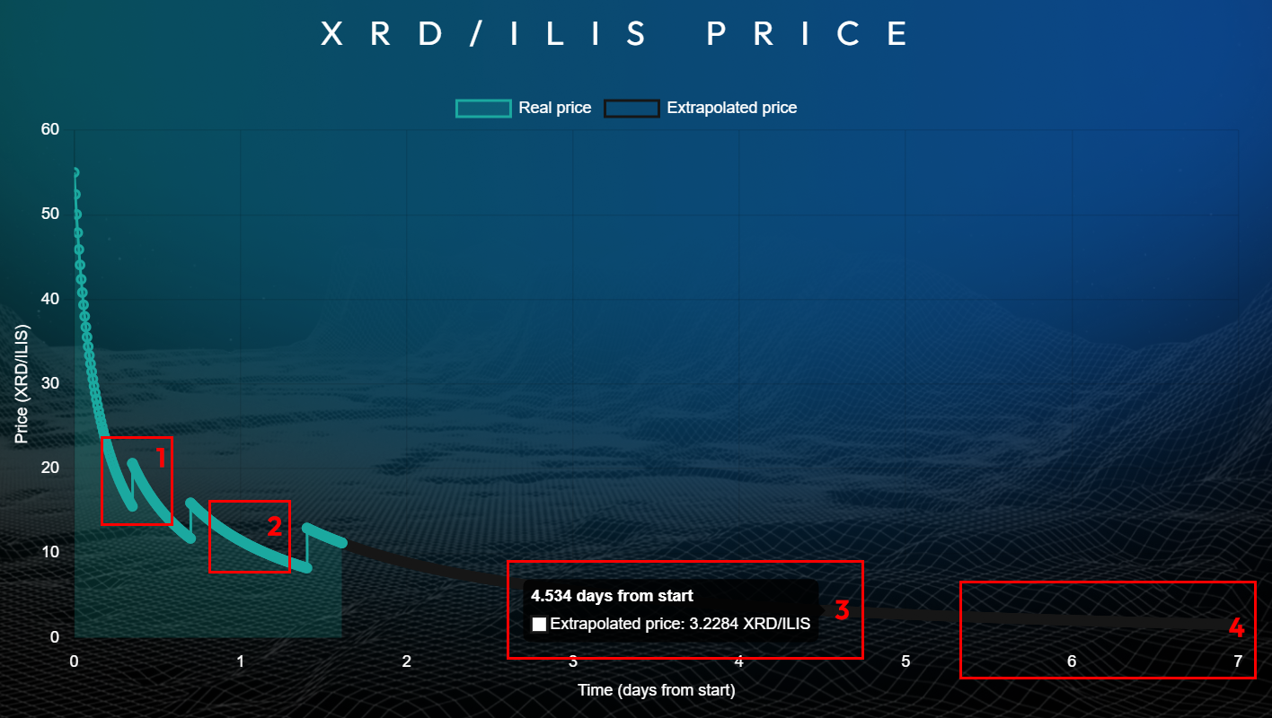 What we see is the price of ILIS denominated in XRD, being traded solely using an LBP. We can see that an ILIS buy increases its price as usual \[1]. However, when no trading takes place, weights shift in such a way that ILIS's price decreases \[2]!