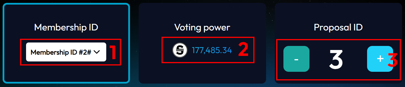 On the top of the page, the user can select a Membership ID to vote with \[1], and see how much voting power their ID posseses \[2]. Don't have a Membership ID? Create one on the Membership page!